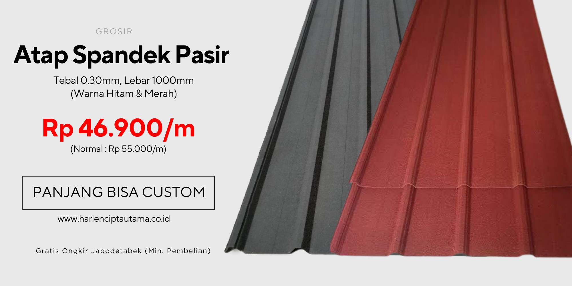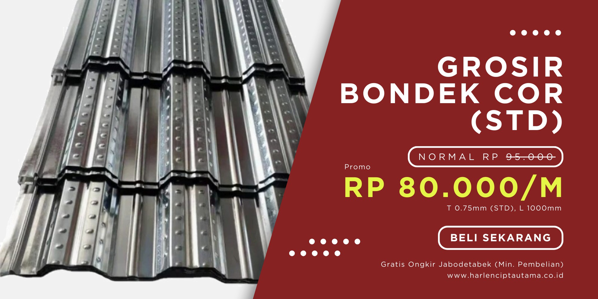 PT. Harlen Cipta Utama, Distributor & Supplier Terpercaya dari Pabrik Besi Baja & Baja Ringan Standar SNI. Jual Harga Murah Seng Gelombang, Spandek, Spandek Galvalum (Warna Hijau, Merah, Biru, Coklat, Pasir Hitam, Pasir Merah), Bondek, Talang Galvalum, H Beam, Baja WF, CNP, INP, UNP, Besi Beton, Besi Polos, Besi Ulir, Besi Nako, Besi Siku, Besi Hollow, Hollow Hitam, Plat Strip, Plat Hitam, Wiremesh, Pipa Hitam, Besi AS, Plat Bordes, Reng, Kanal C, Pagar BRC, Bata Merah, Semen, Pipa PVC. Siap suplai banyak untuk berbagai Proyek Properti, Proyek Infrastruktur, dan Toko Bahan Bangunan di Jakarta, Bogor, Sentul, Depok, Tangerang, Bekasi, Cikarang, Banten, Bandung, Cikampek, Purwakarta, Cirebon, Sukabumi, Cianjur dan Bisa Kirim se-Indonesia.